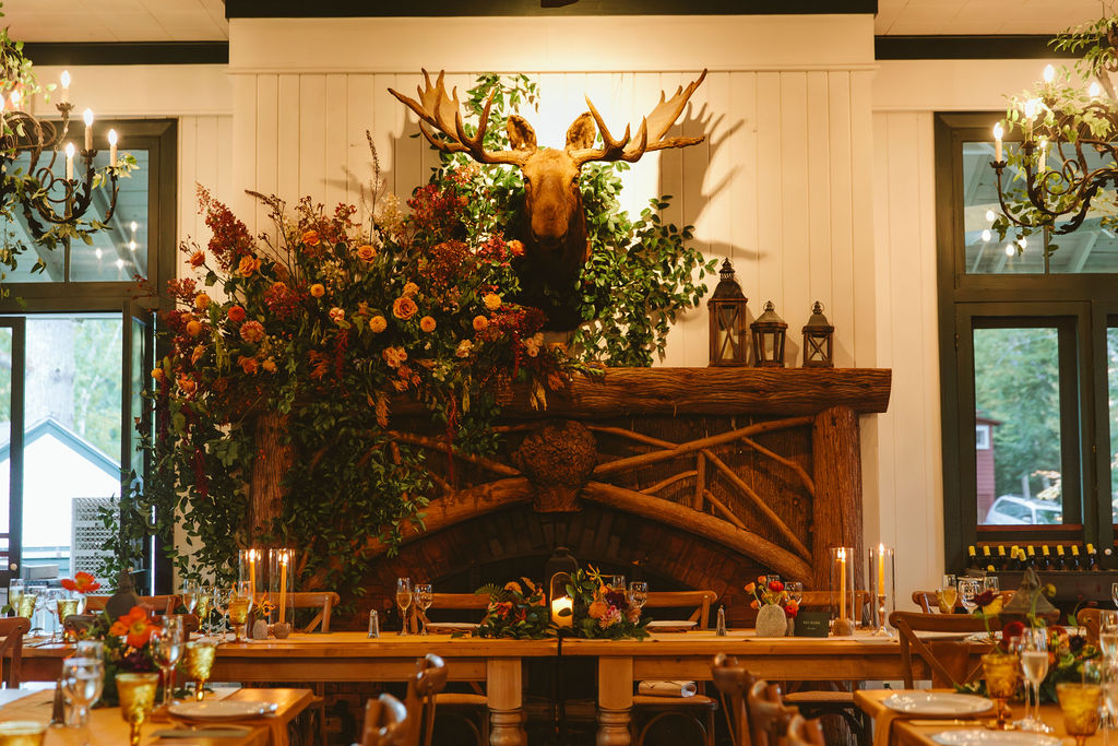 Cocktail hour unfolded in front of the historic Adirondack Lodge, where guests enjoyed the crisp autumn air and the rustic charm of the property. Dinner followed in the main dining room, warm with candlelight, toasts, laughter, and big hugs between friends and family….and some tears for sure.