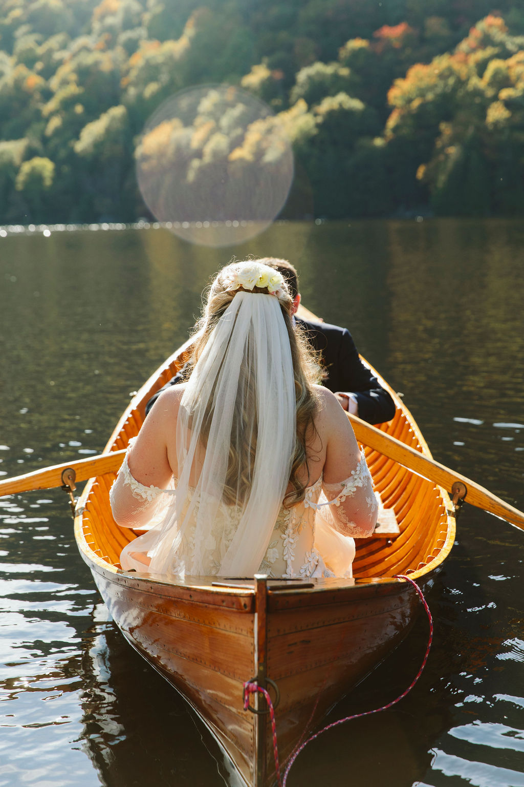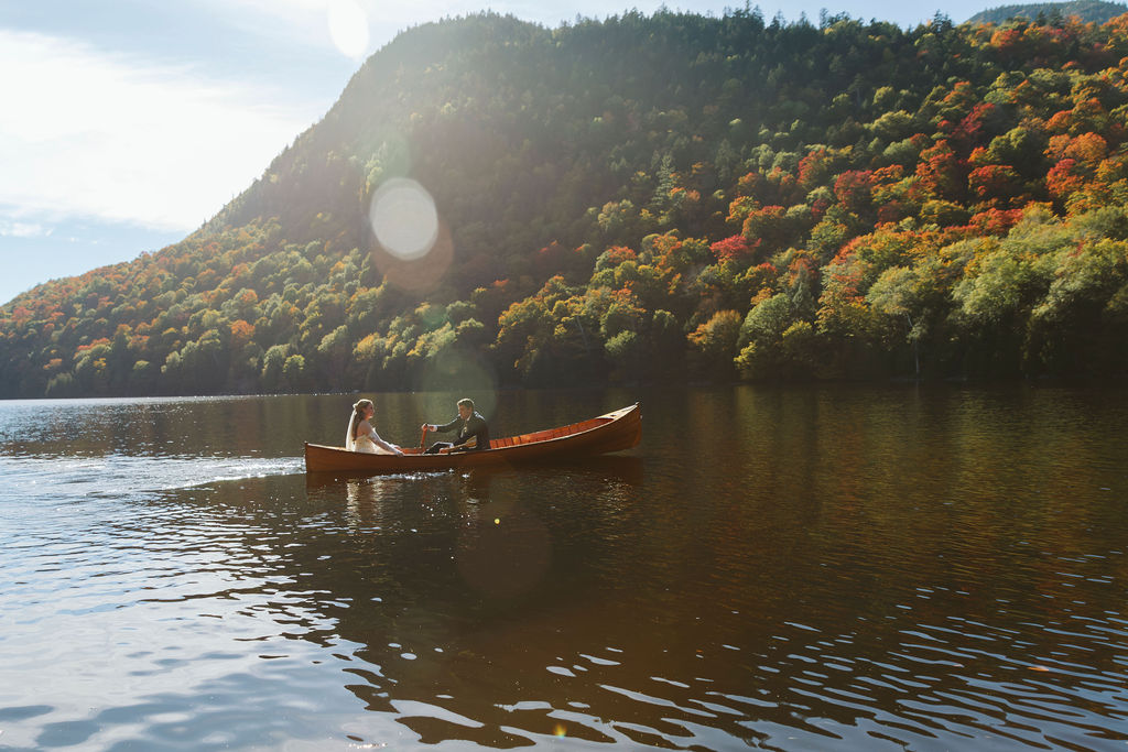That afternoon, the wedding party took a bus from the main lodge down to the lake for the first look and portraits. The ride was full of laughter and that bright, buzzing anticipation that comes right before everything begins. Down by the water, the mountains wrapped around them in full fall color. Lilly and Will shared their first look on the shoreline before slipping out in a canoe for a quiet, breathtaking moment on the still lake, just the two of them held by the season.