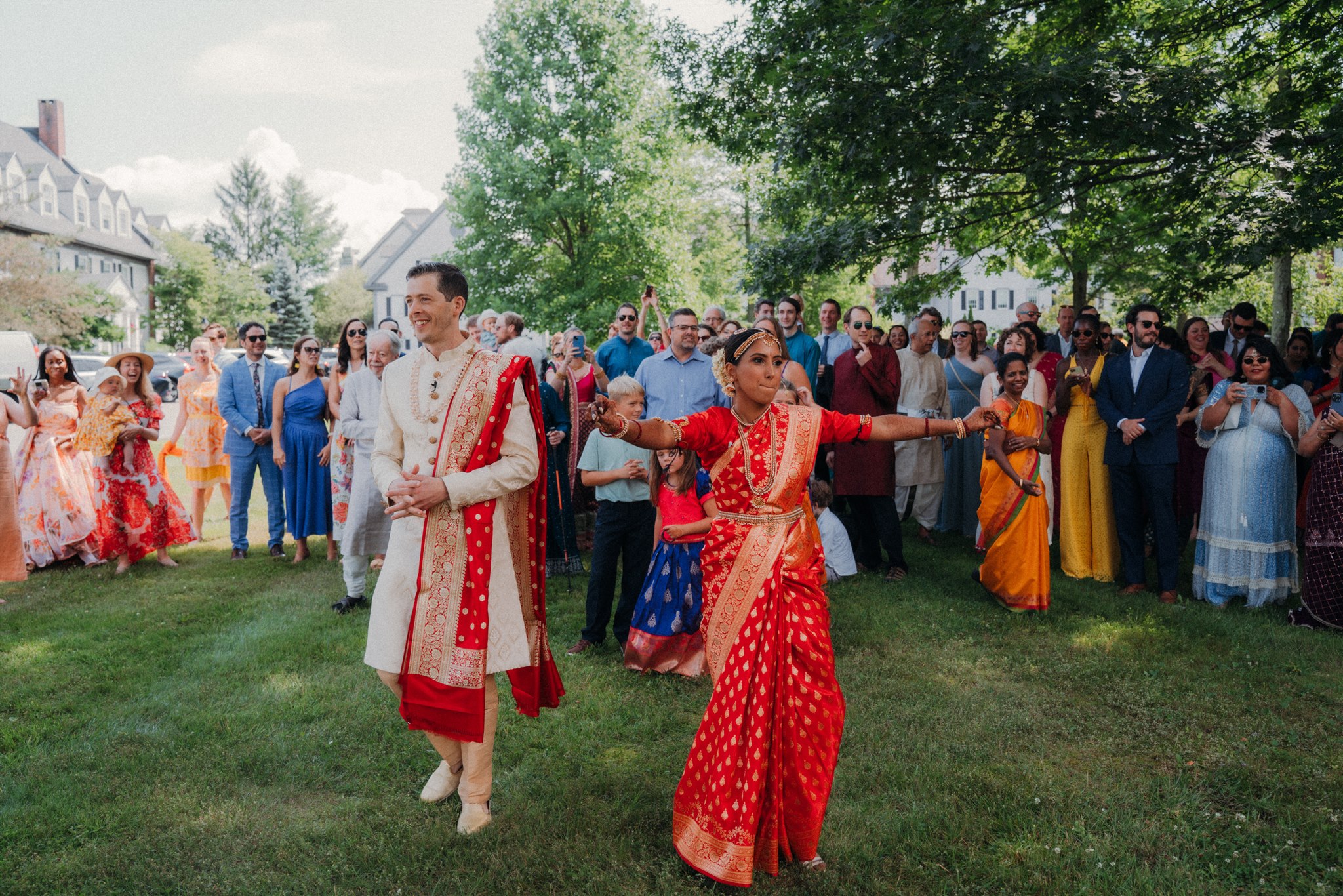 The following morning began with a Baraat, a joyful procession leading into a Hindu ceremony held in the garden at the Essex Spa. Supraja is Indian, and Adam — a proud Mainer — embraced every part of the tradition with such openness and joy. Their ceremony beautifully honored Supraja’s heritage while reflecting the shared life they’ve built together.