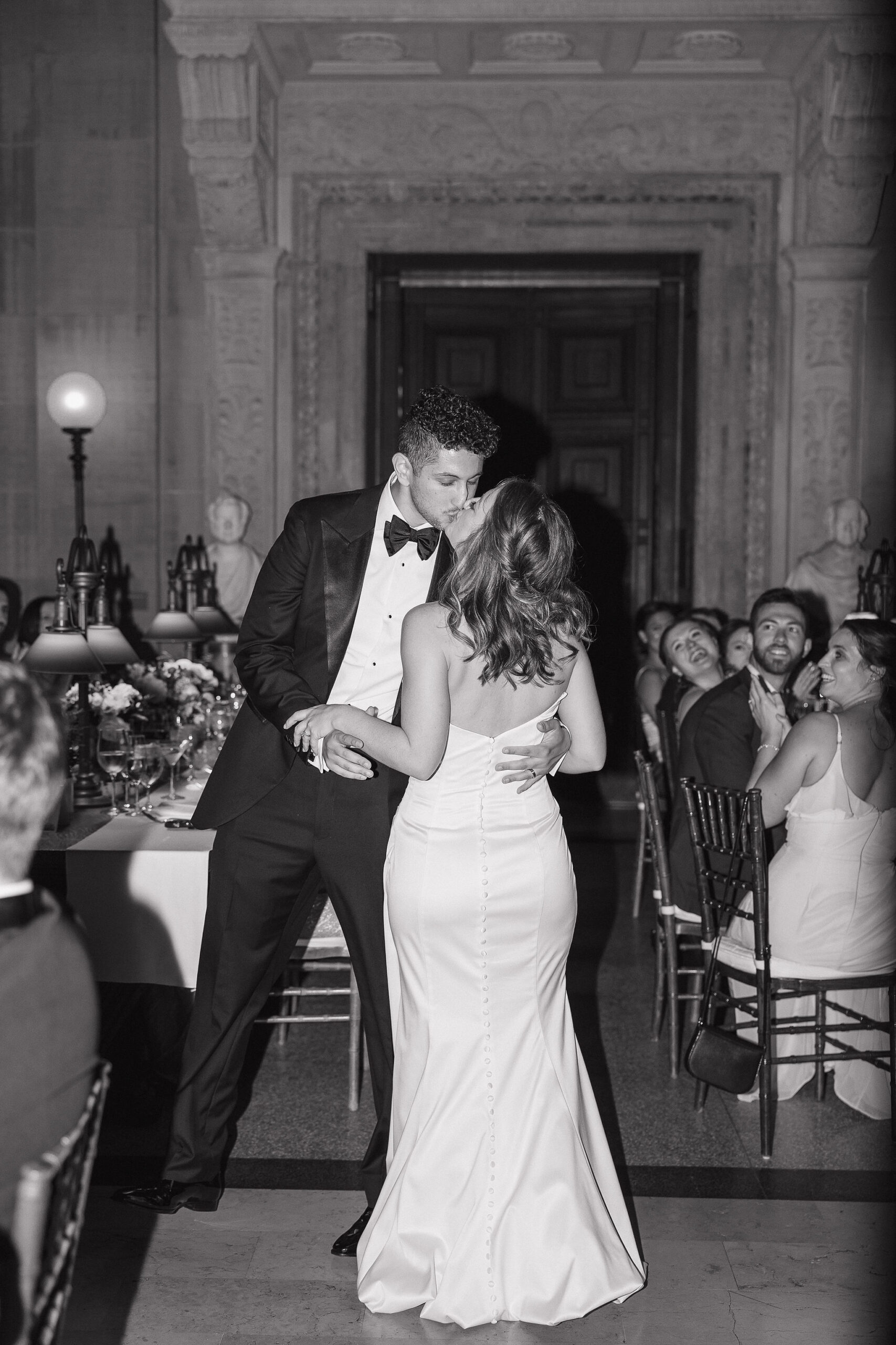 Guests were then invited upstairs to Bates Hall for the reception. With its soaring ceilings, iconic green library lamps, and majestic architecture, Bates Hall is one of the most striking reception spaces in Boston. Dinner and speeches unfolded in this extraordinary setting before guests moved into the Abbey for dancing.