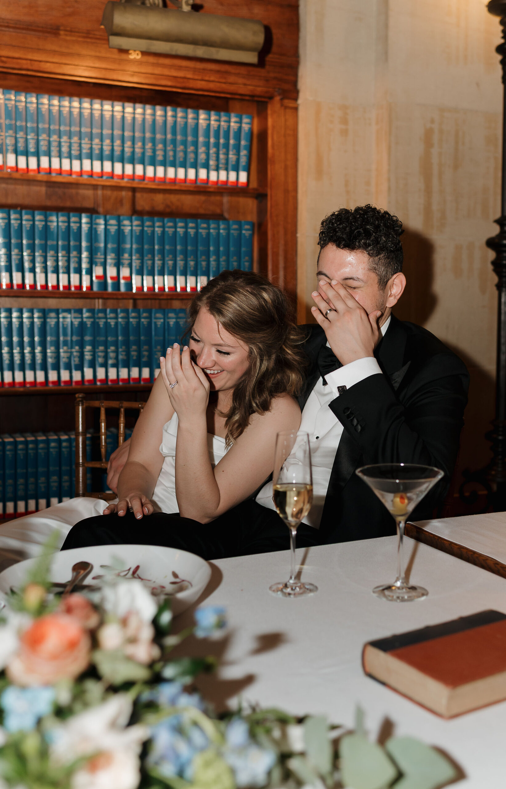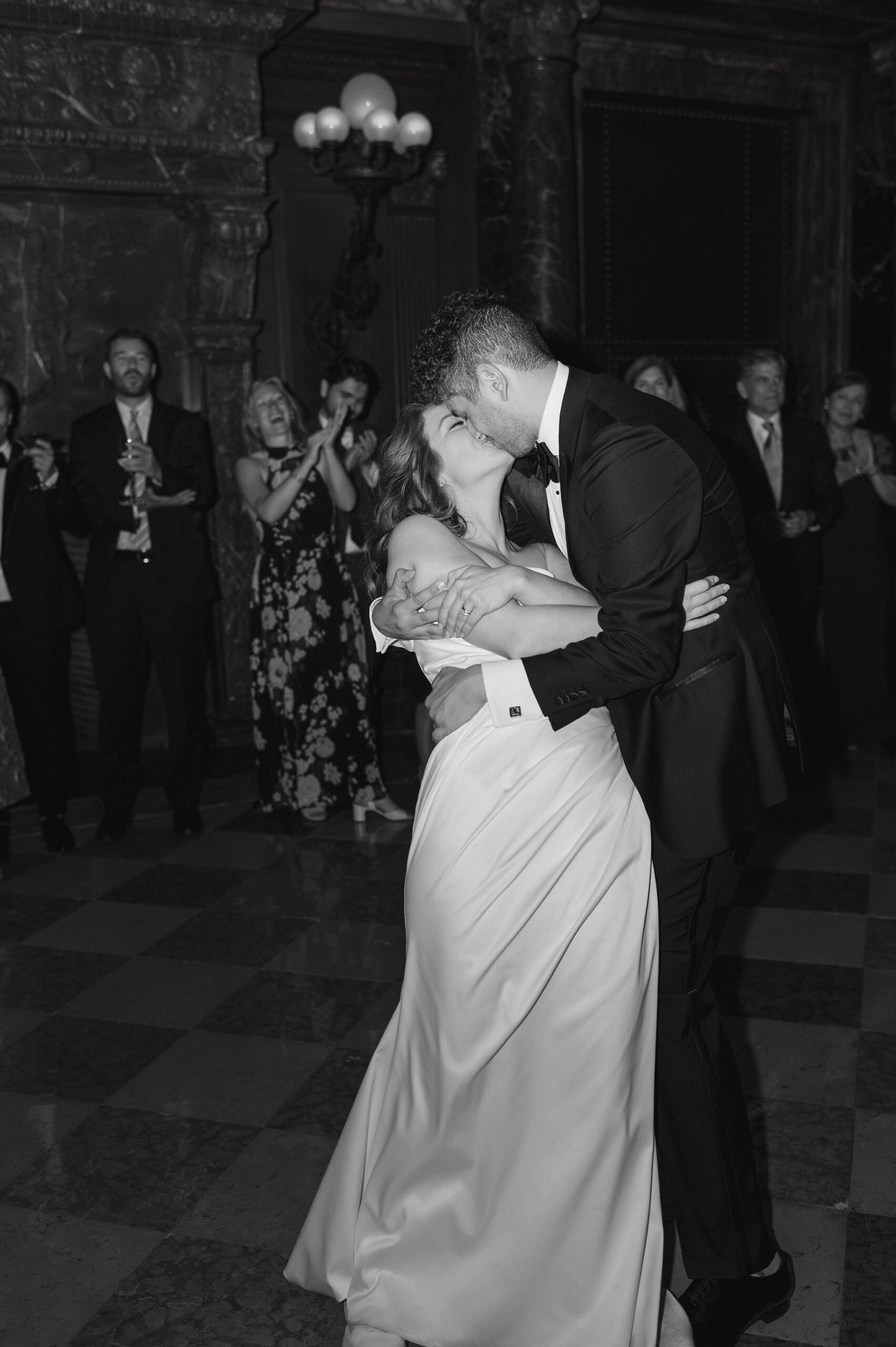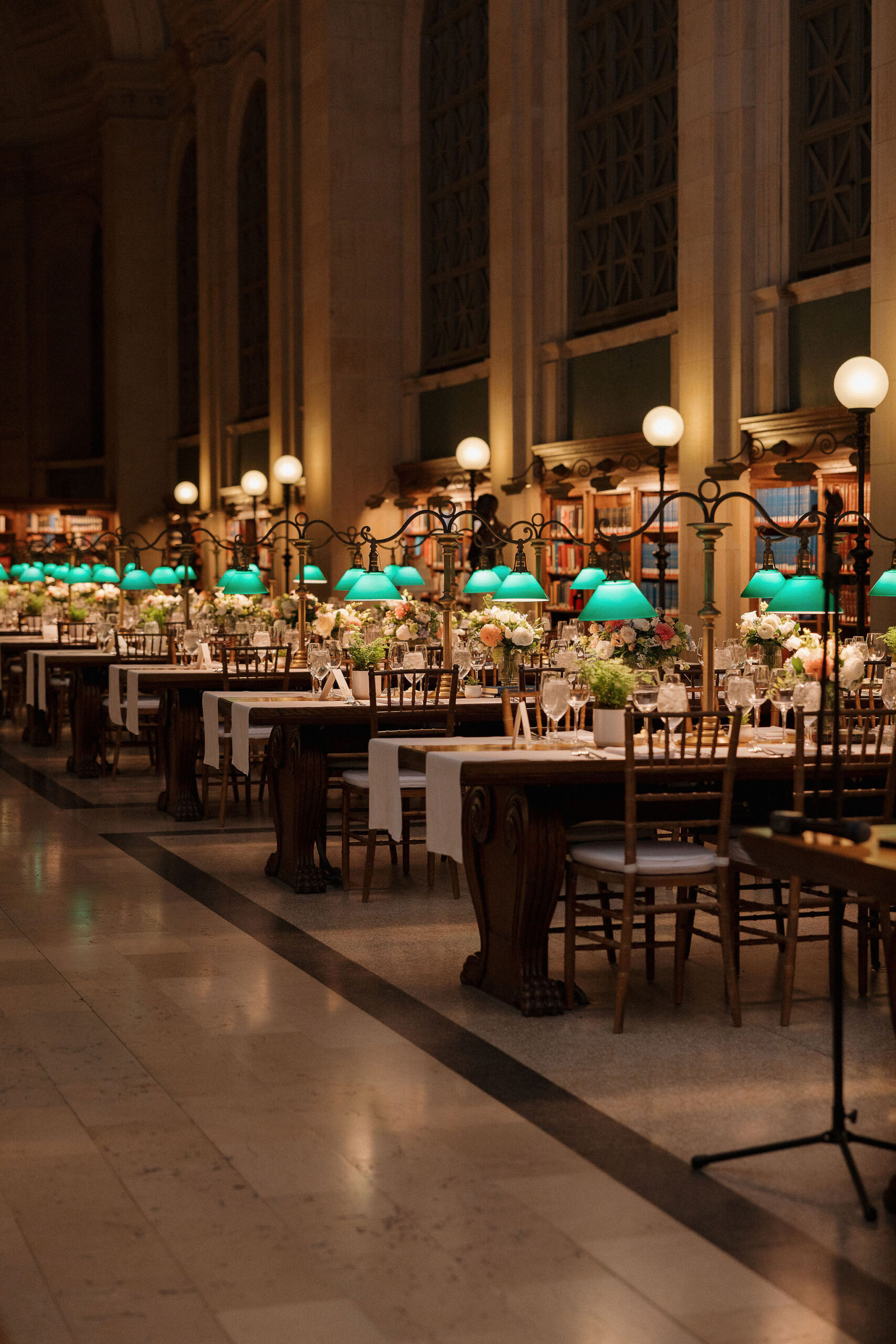 Guests were then invited upstairs to Bates Hall for the reception. With its soaring ceilings, iconic green library lamps, and majestic architecture, Bates Hall is one of the most striking reception spaces in Boston. Dinner and speeches unfolded in this extraordinary setting before guests moved into the Abbey for dancing.