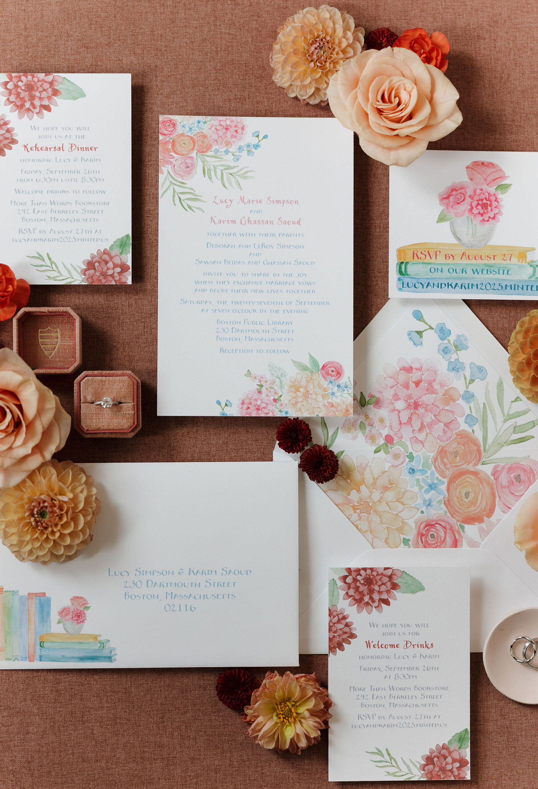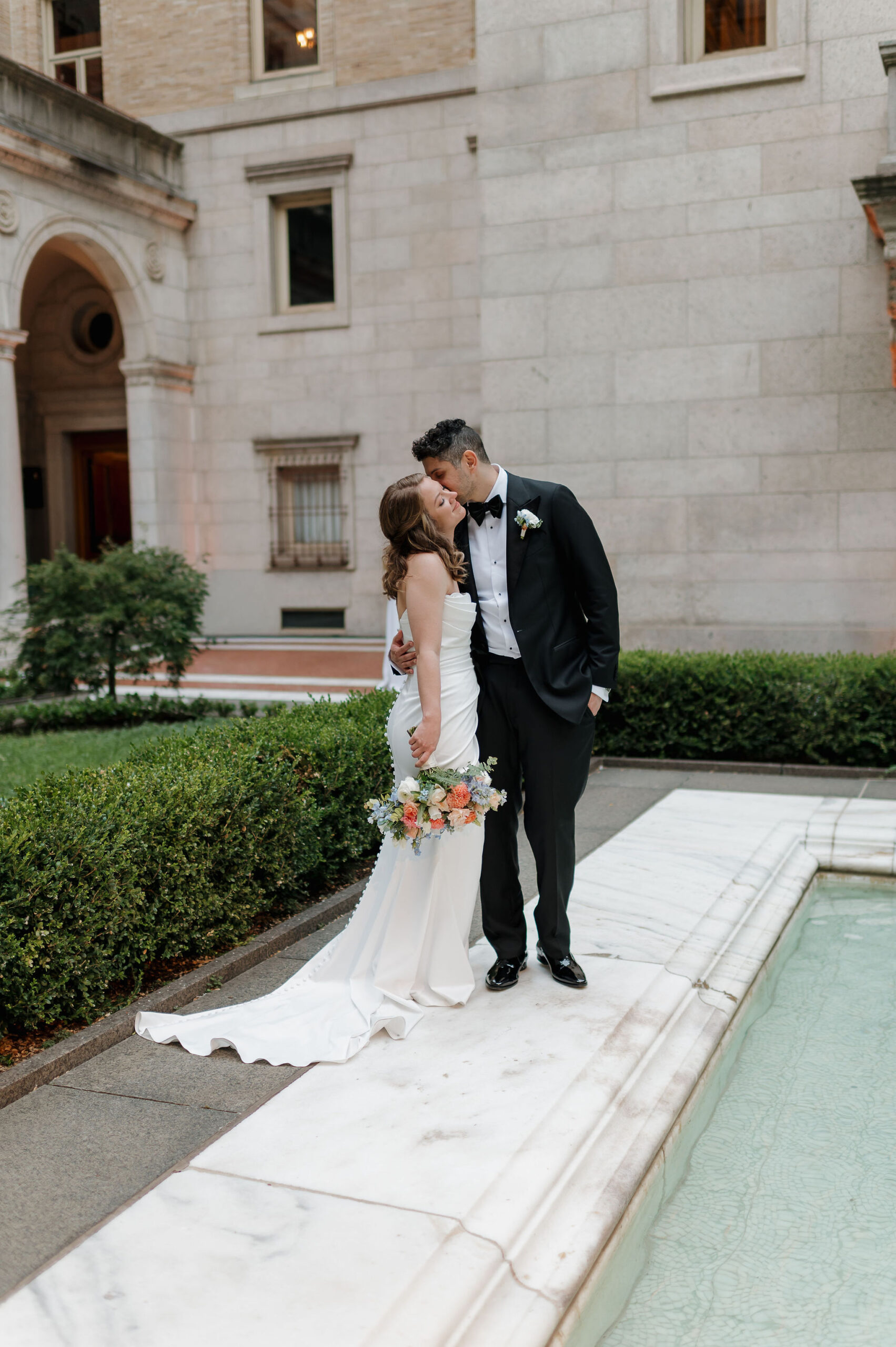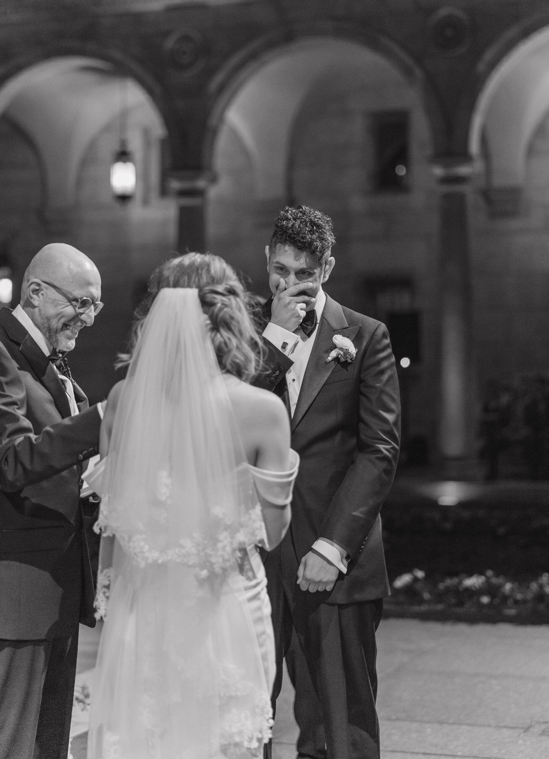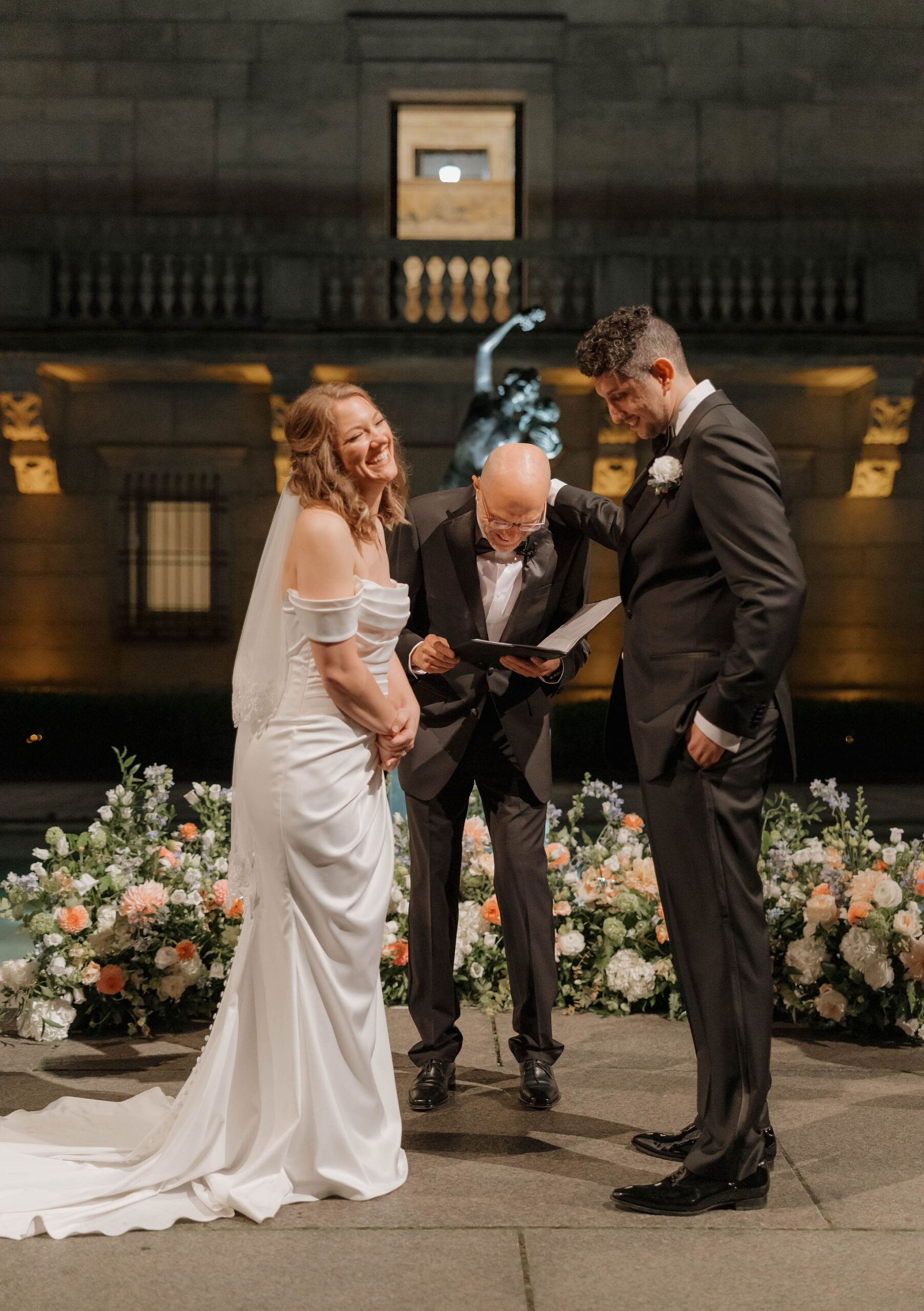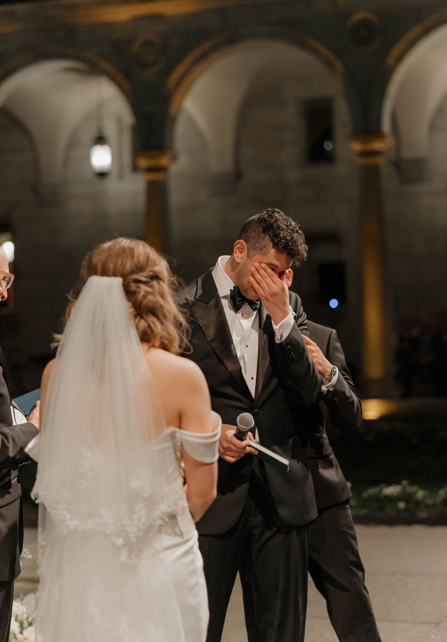 Guests arrived for the ceremony at the Boston Public Library, where Lucy and Karim were married in the courtyard with the illuminated fountain glowing behind them. Karim’s uncle officiated the ceremony, making it deeply personal and meaningful. At the end, Lucy surprised Karim by delivering her vows in Arabic, a moment that was both emotional and unforgettable.