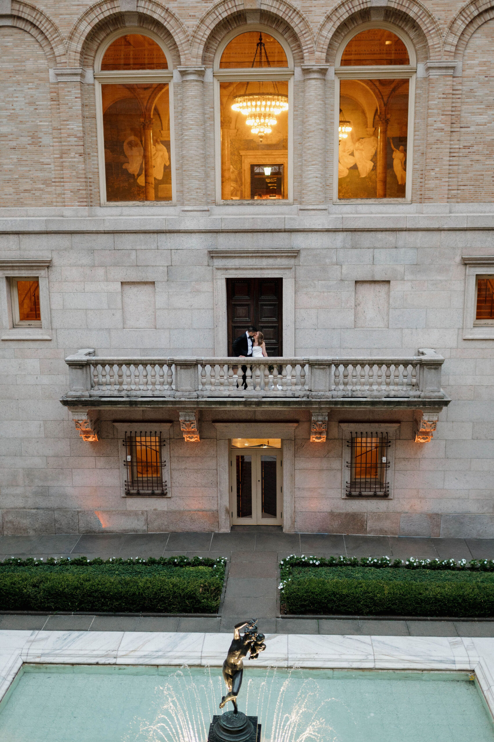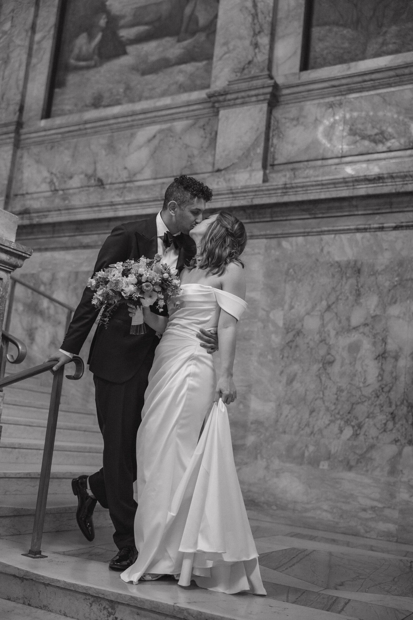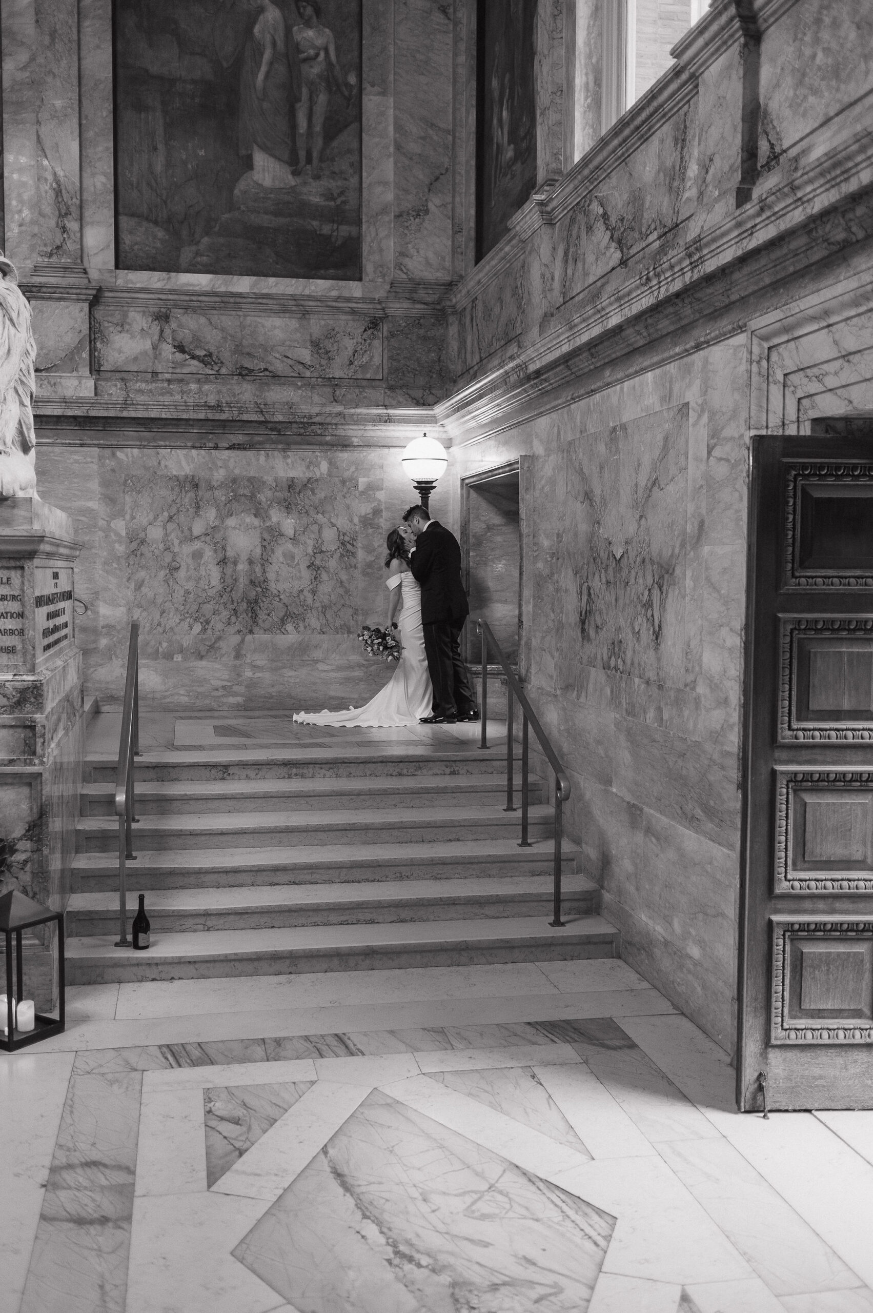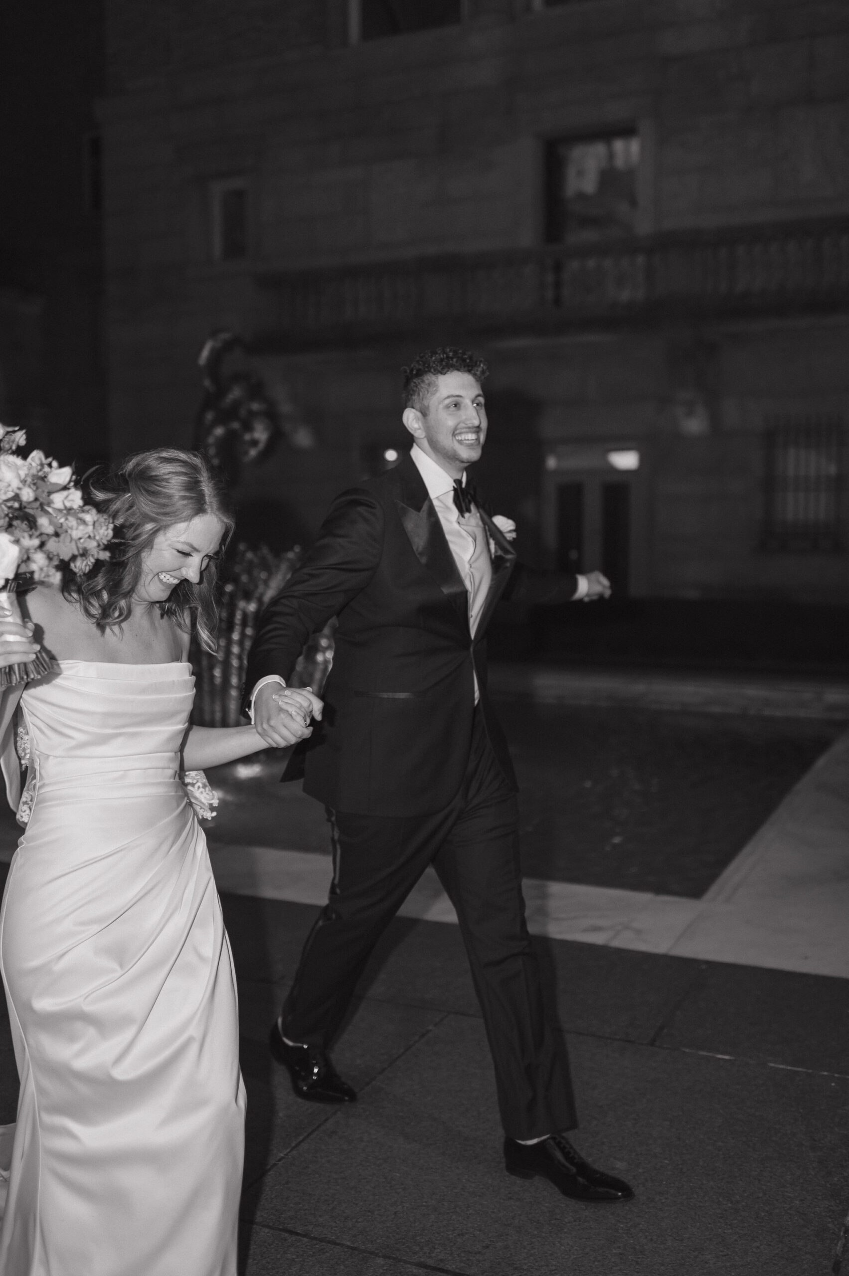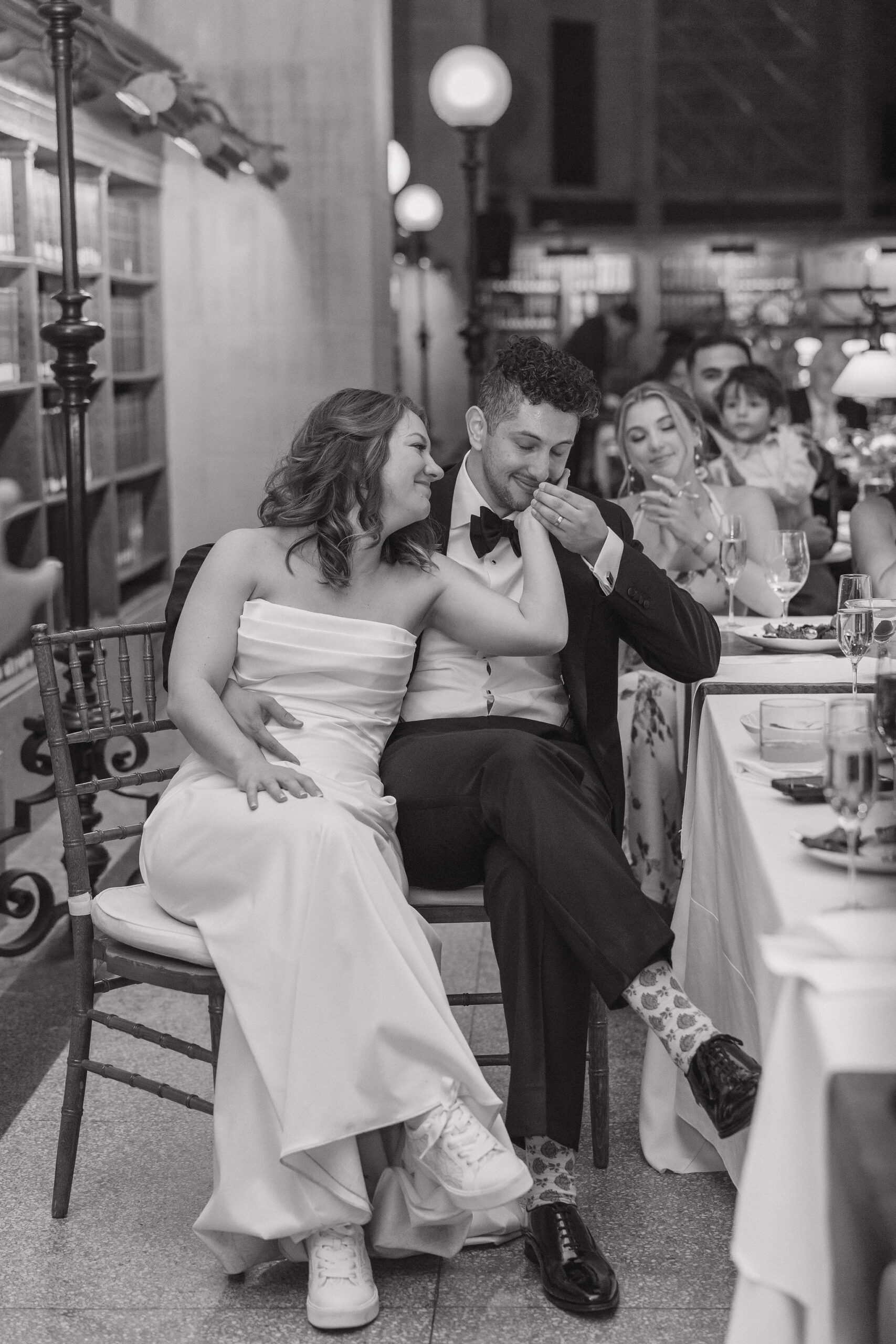 Guests arrived for the ceremony at the Boston Public Library, where Lucy and Karim were married in the courtyard with the illuminated fountain glowing behind them. Karim’s uncle officiated the ceremony, making it deeply personal and meaningful. At the end, Lucy surprised Karim by delivering her vows in Arabic, a moment that was both emotional and unforgettable.