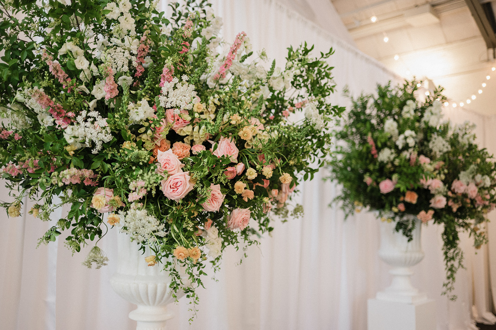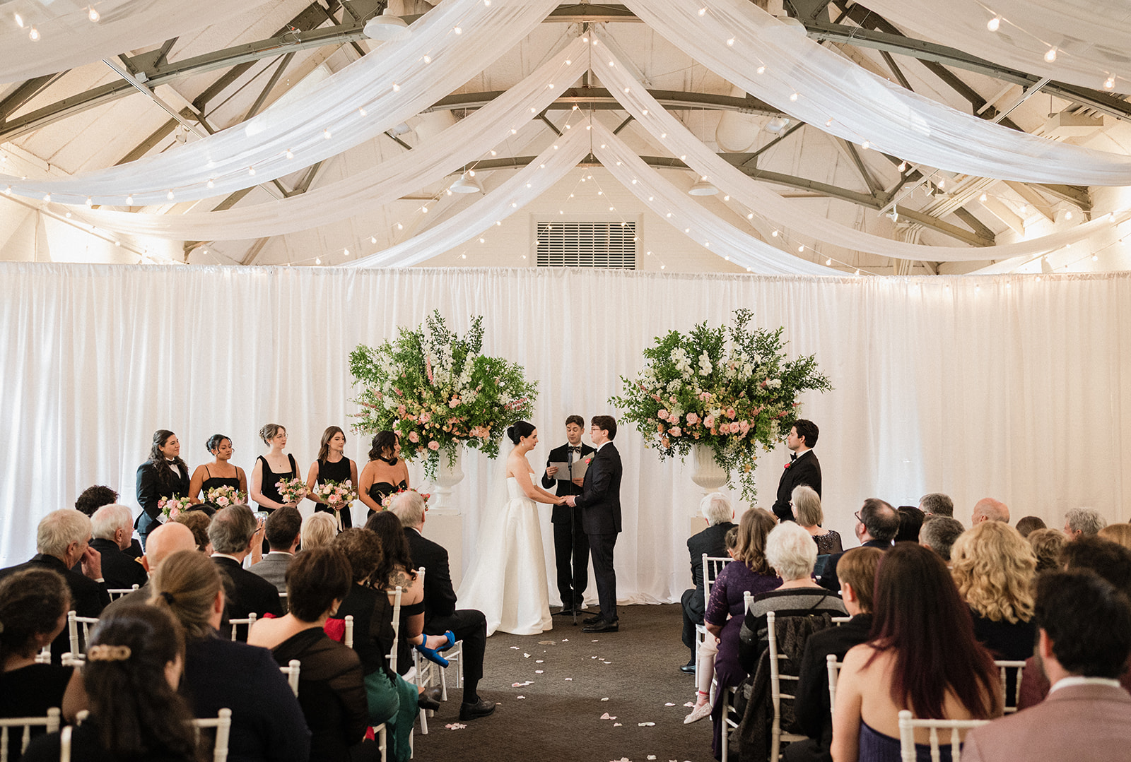 Thanks to the flexibility of Elm Bank and an incredible vendor team, we executed a seamless indoor plan. We transformed the reception space by draping off half of the room, pushing all of the reception tables behind a large draped wall. On the other side, we set up ceremony seating, creating a beautiful and intimate ceremony space.