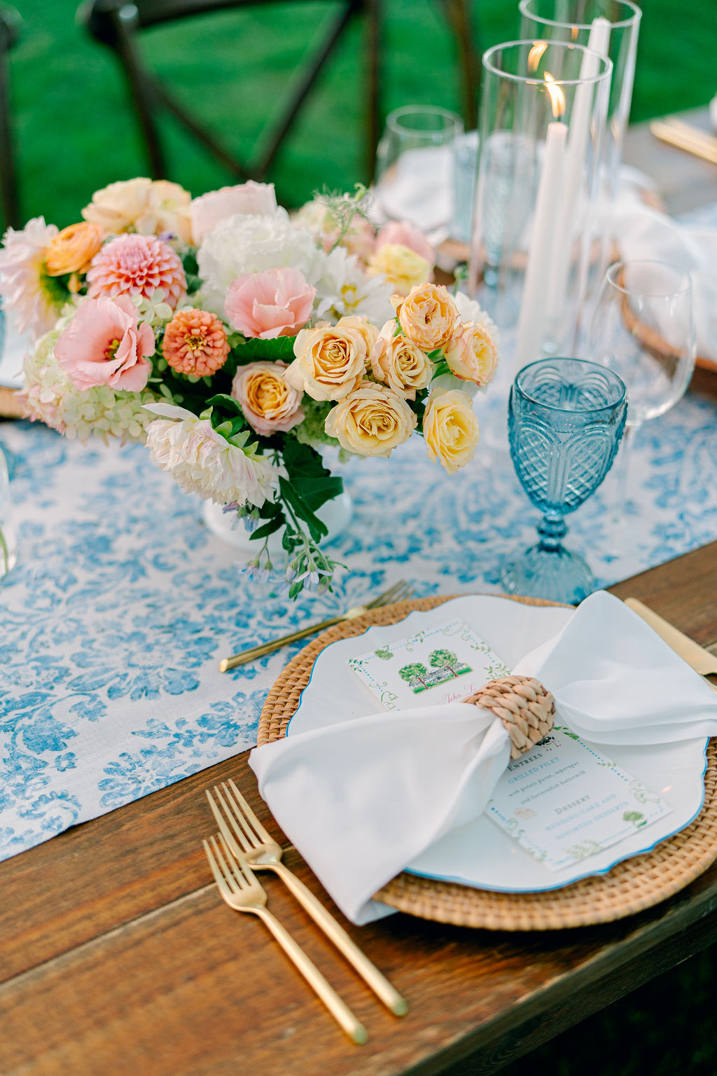 The reception design was layered and inviting, featuring blue glassware, rattan chargers, scalloped charger plates, bread and butter plates, gold flatware, and printed menus. Chargers were sourced from Peak Event Services and Bloomberg, while flatware was provided by By Emma B, creating a tabletop that felt both polished and relaxed.