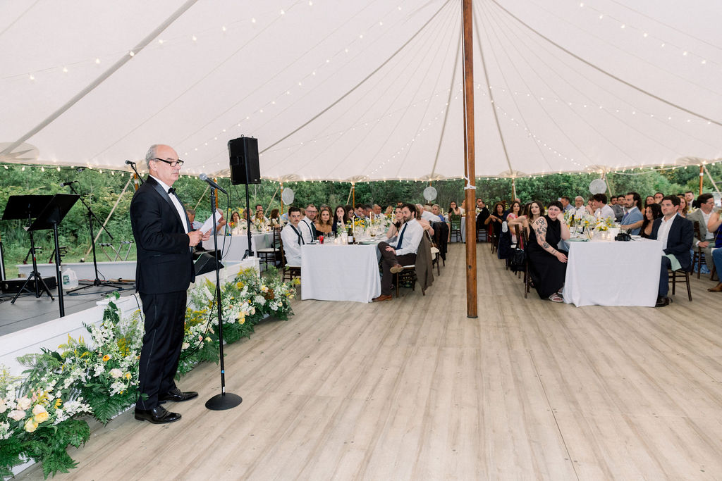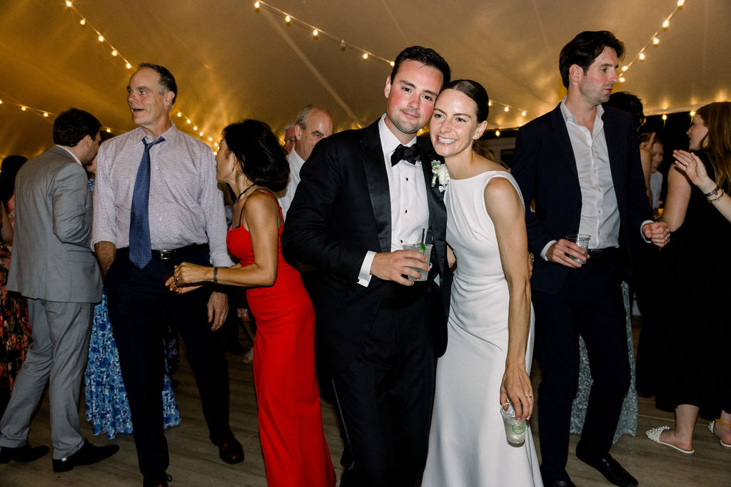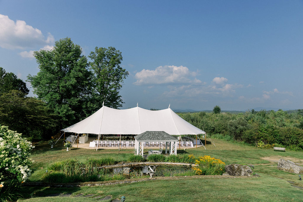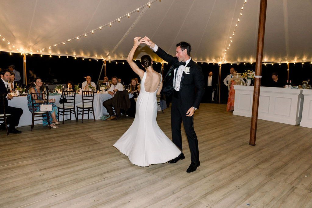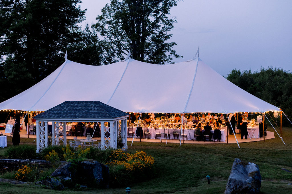 Later, guests moved into the tent for the reception. Lakes Region Tent and Event installed the tent along with a full floor, creating a comfortable and elegant space for dinner and dancing.