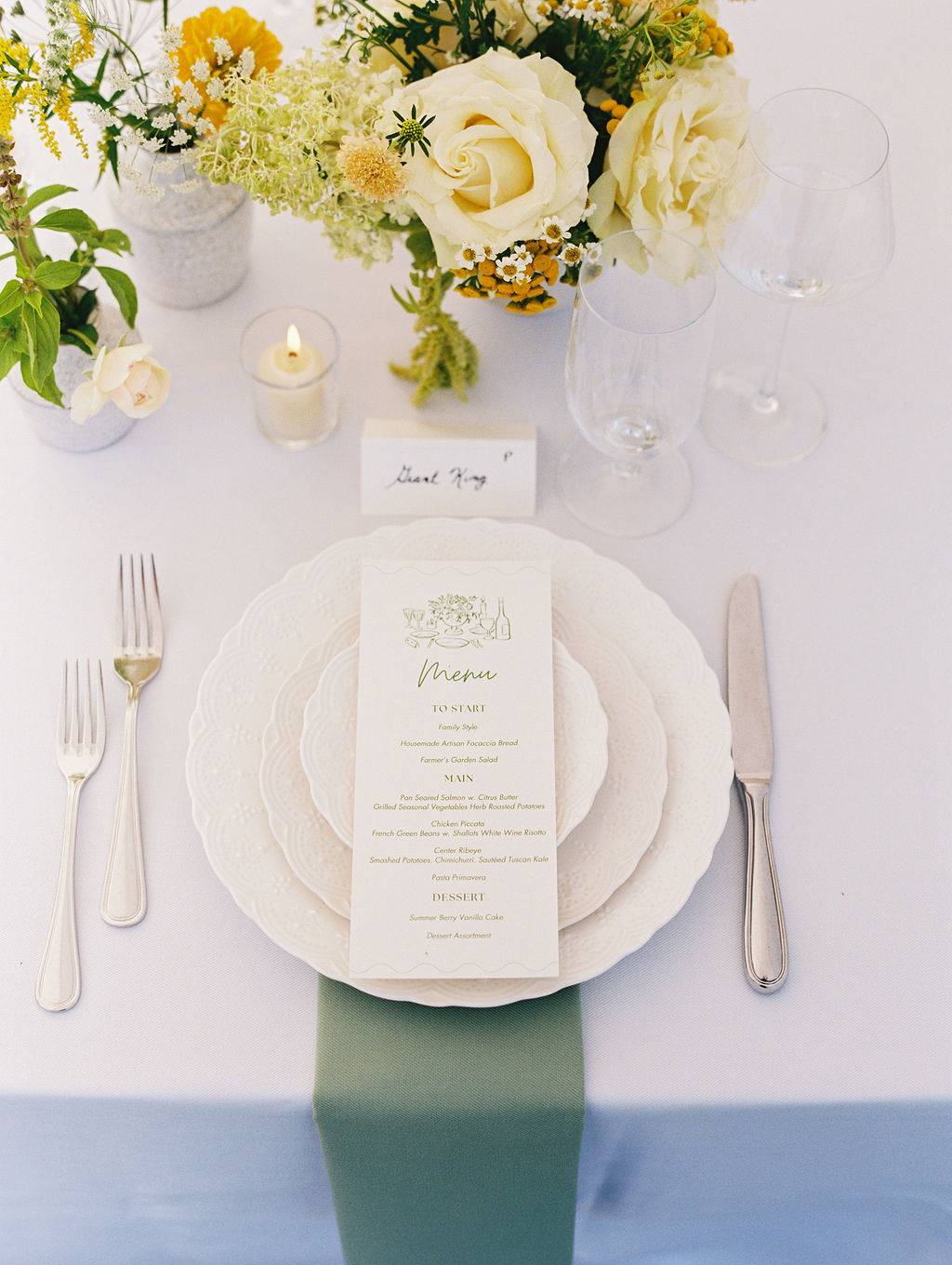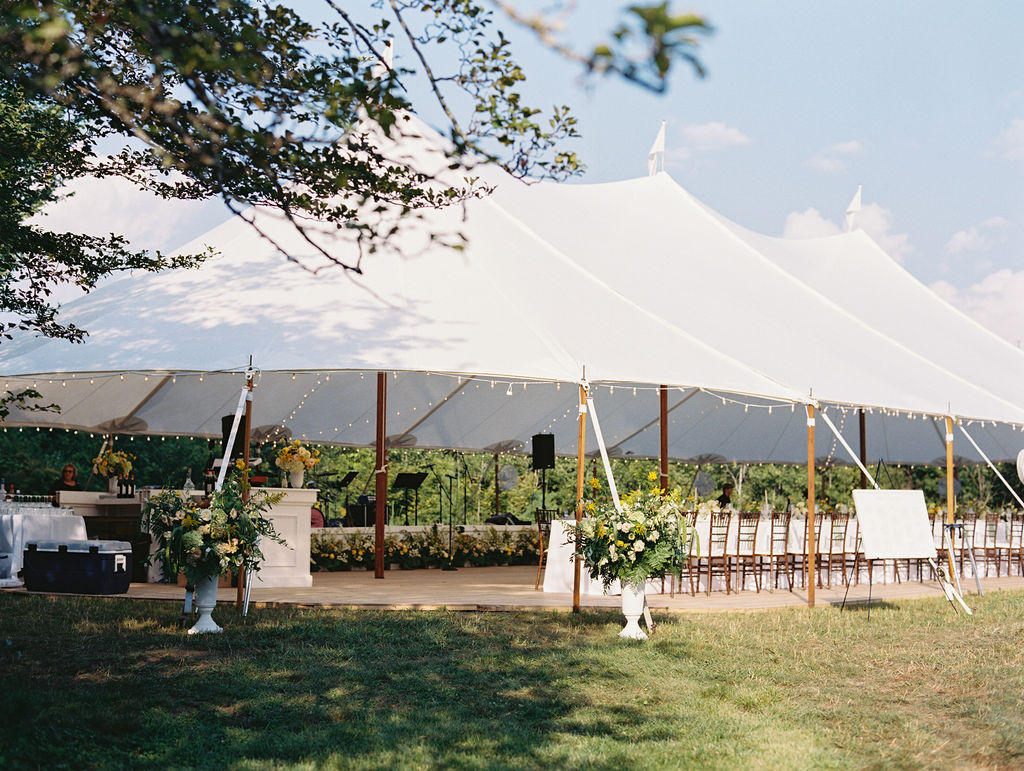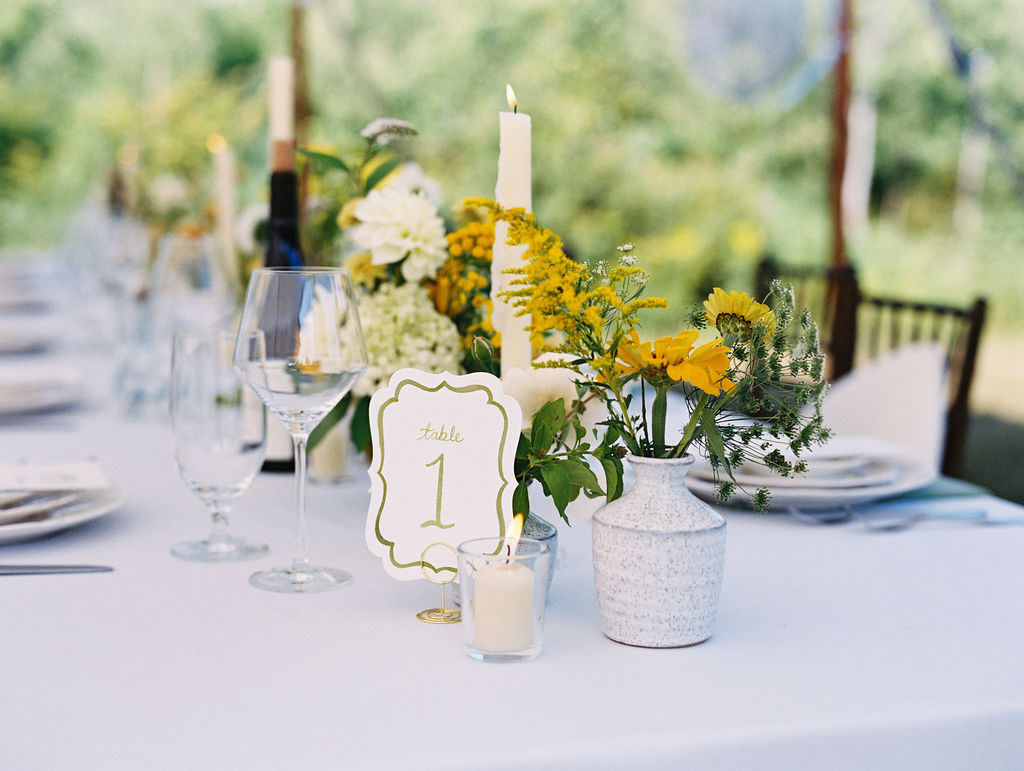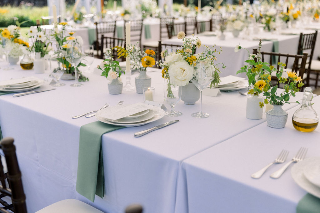 Fiorella envisioned the interior of the tent as a European-style outdoor dinner. As a result, the design felt clean, classic, and intentional. Peak Event Services provided linens, napkins, dinnerware, flatware, and glassware, all of which layered together beautifully.