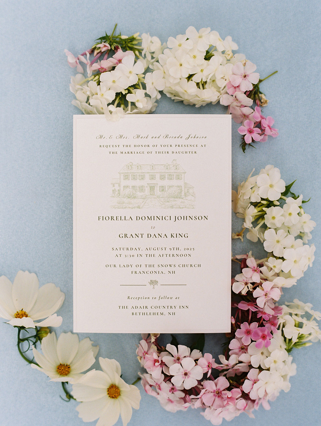Fiorella and Grant were married in the White Mountains of New Hampshire, with their celebration centered at the Adair Country Inn. Tucked into the hills of Bethlehem, the inn offers sweeping mountain views, classic New England charm, and a peaceful setting that feels both welcoming and refined.